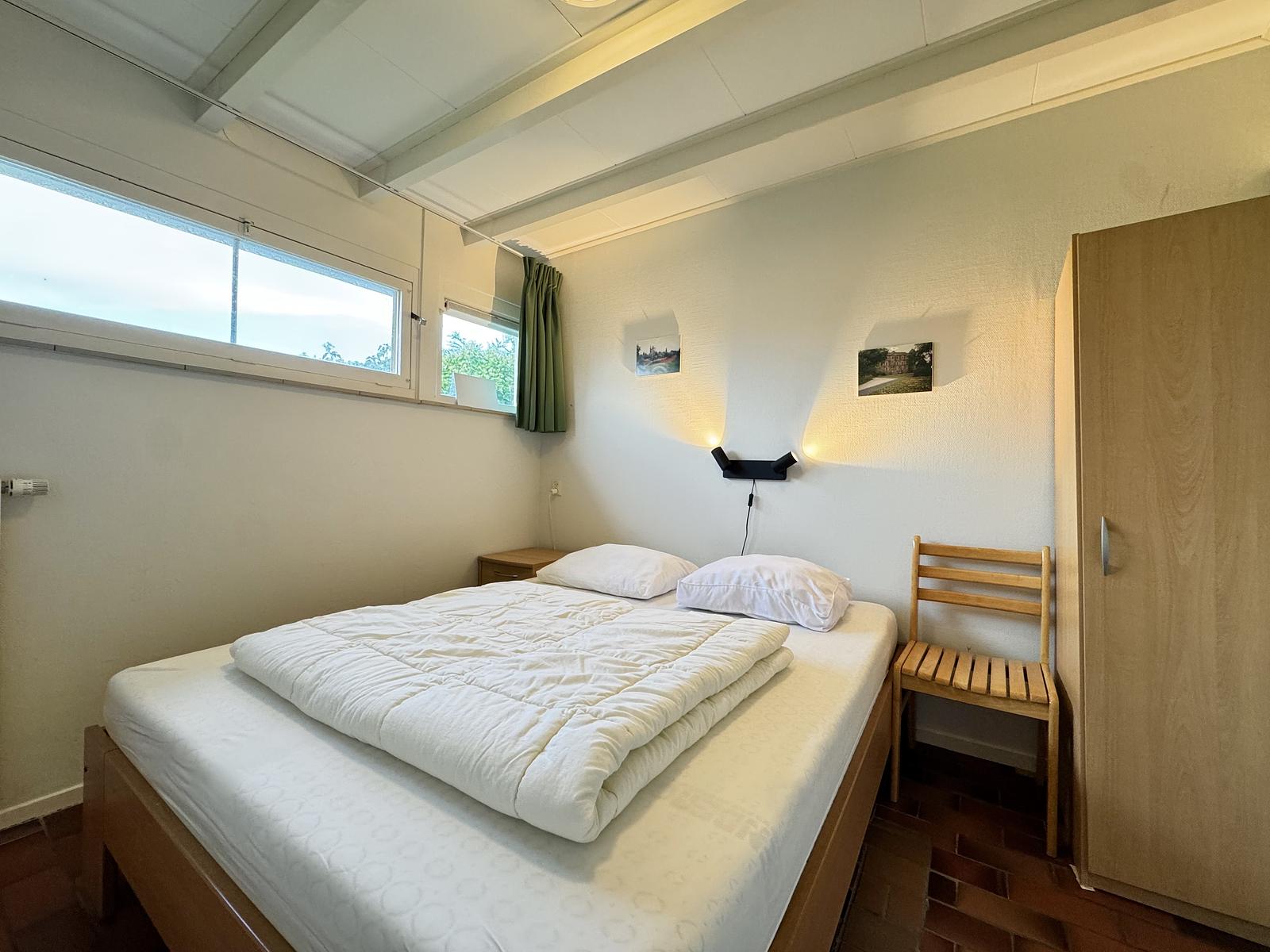 âEen slaapkamer met een tweepersoonsbed met 2 matrassen (2 x 80 x 200) en een tweepersoons dekbed.