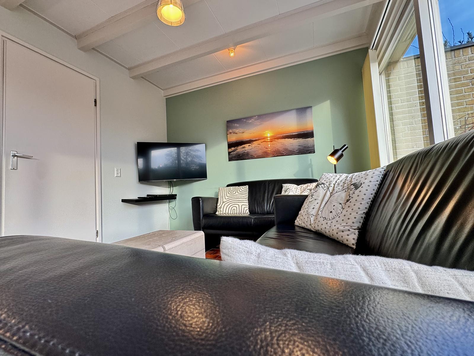 De woonkamer heeft een tv met kabelaansluiting, radio/CD-speler en DVD-speler. In de woonkamer staan twee tweezitsbanken en een stoel. De bungalow heeft een moderne open keuken met gasfornuis, afzuigkap, magnetron, koffiezetapparaat, waterkoker, toaster, koelkast met vriesvakje en vaatwasmachine. Hier bevindt zich ook de eethoek.